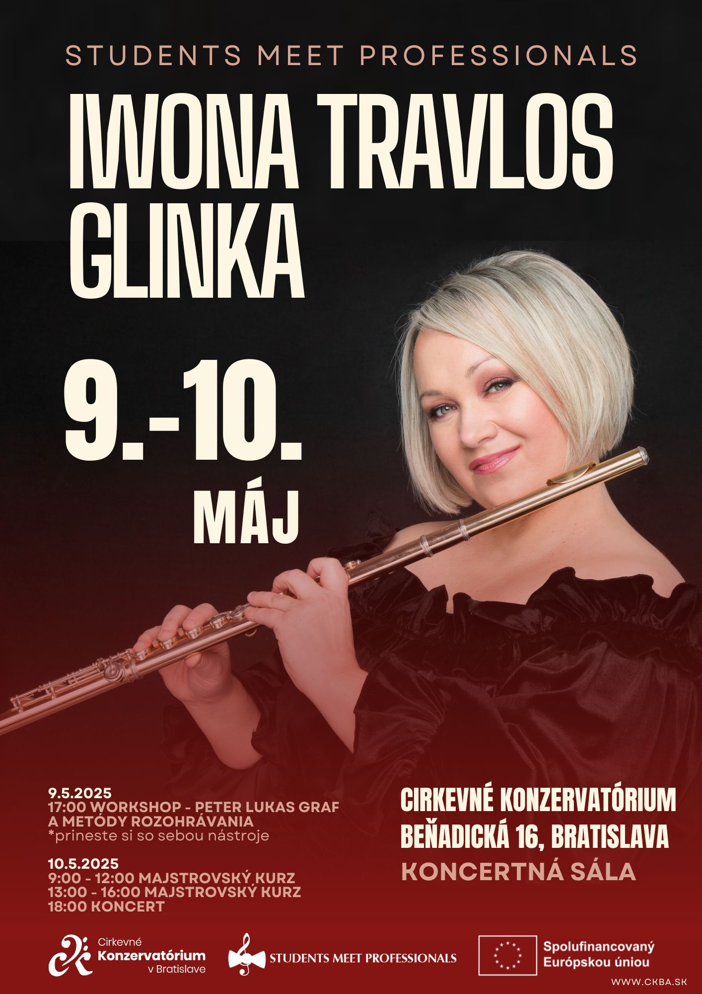 V dňoch 9. – 10. mája sa na Cirkevnom konzervatóriu uskutoční ďalšie podujatie projektu Students Meet Professionals, tentokrát zamerané na flautové umenie. Na Slovensko pricestuje známa poľská flautistka, momentálne žijúca v Grécku, 𝗜𝗪𝗢𝗡𝗔 𝗧𝗥𝗔𝗩𝗟𝗢𝗦 𝗚𝗟𝗜𝗡𝗞𝗔.