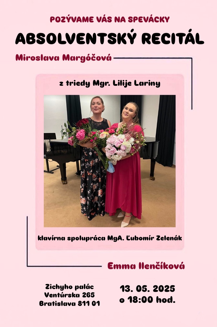 Speváčky Emma Ilenčíková a Miroslava Margóčová z triedy Mgr. Lilije Lariny Vás pozývajú na absolventský recitál, ktorý sa uskutoční 13. mája o 18:00 v Zichyho paláci na Ventúrskej ulici.