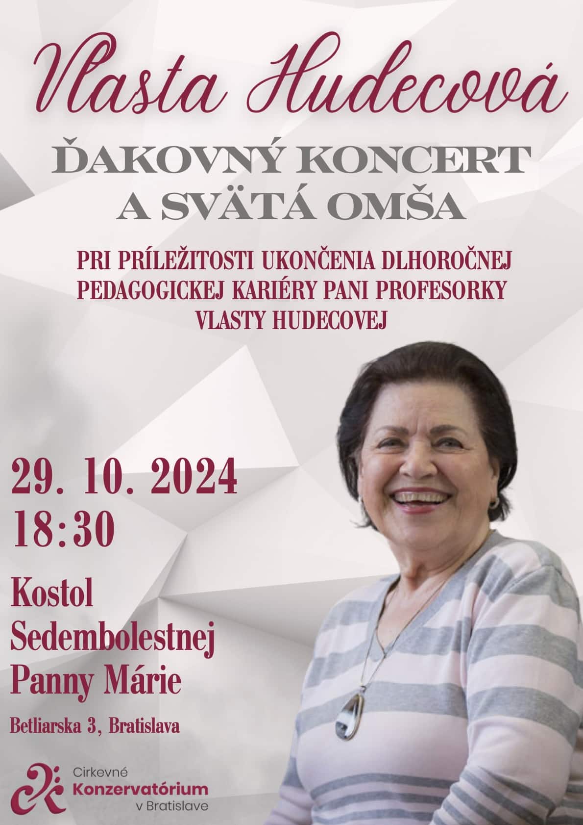 Srdečne vás pozývame dňa 29.10.2024 na ĎAKOVNÝ KONCERT PRE PANI PROFESORKU VLASTU HUDECOVÚ pri príležitosti ukončenia jej pedagogickej činnosti na našej škole, kde jej o 18:30 počas svätej omše v kostole Sedembolestnej Panny Márie v Petržalke (Betliarska 3) budeme vyprosovať hojné zdravie a požehnanie.