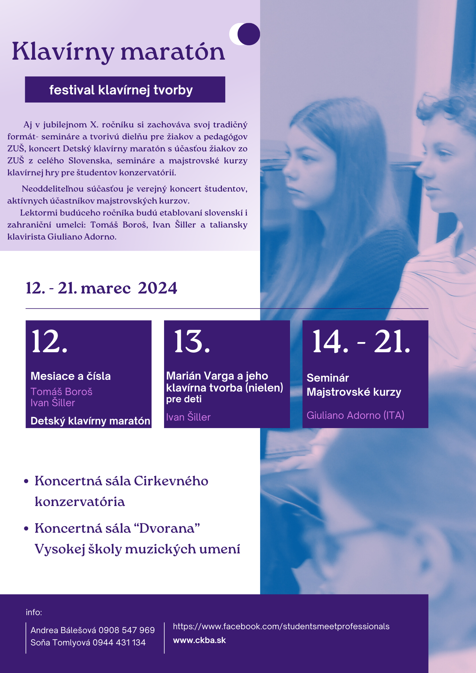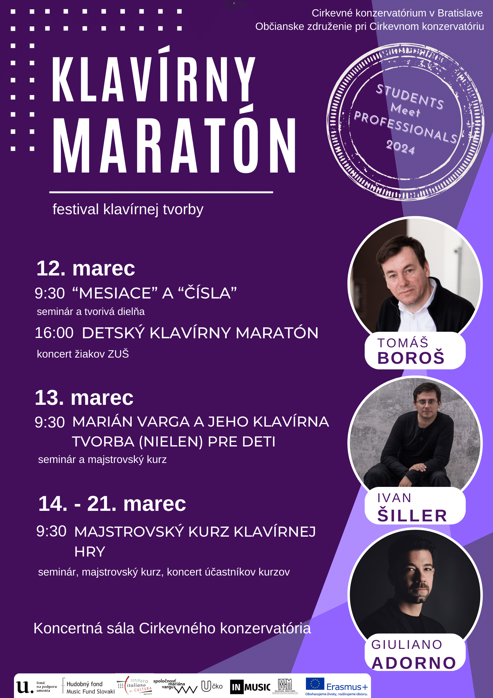 Srdečne Vás pozývame na X. ročník festivalu klavírnej tvorby Klavírny maratón, ktorý sa koná 12.- 21. marca 2024 v rámci projektu Students Meet Professionals.