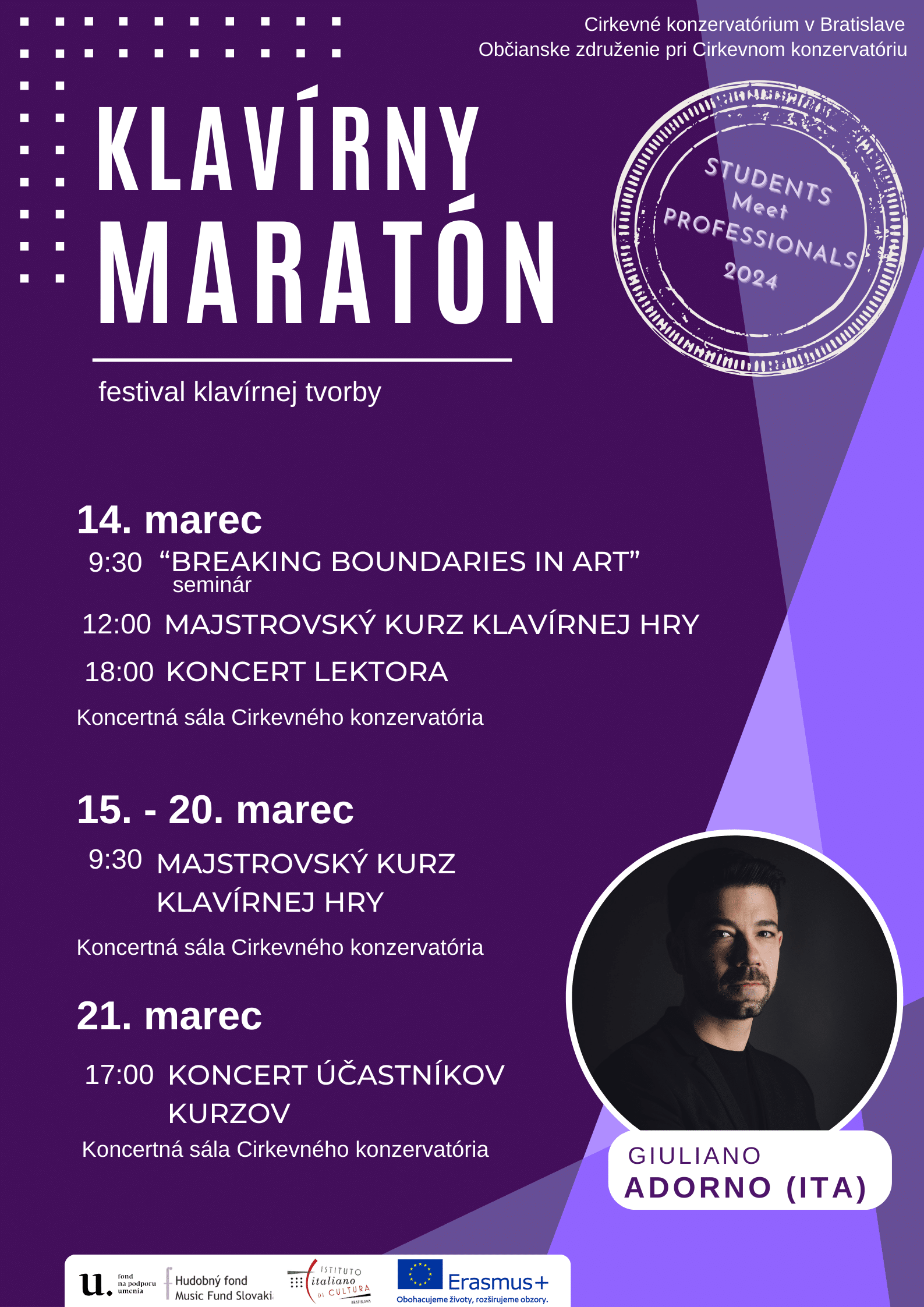 Súčasťou podujatia budú aj klavírne kurzy s talianskym lektorom Giulianom Adornom, ktorý sa predstaví aj klavírnym recitálom 14. marca 2024.