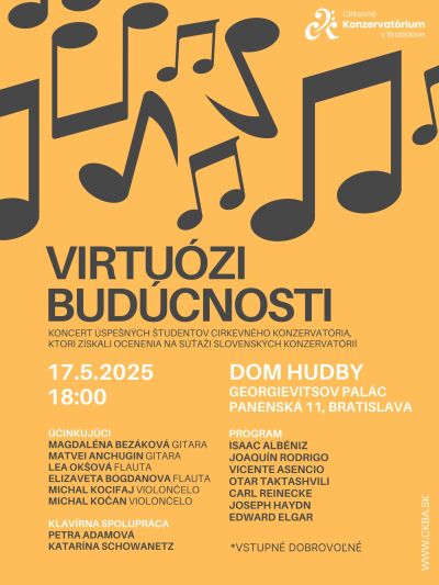 Srdečne Vás pozývame na koncert „Virtuózi budúcnosti“, ktorý sa uskutoční 17.5.2025 o 18:00 v Dome hudby (Georgievitsov palác) na Panenskej 11 v Bratislave.